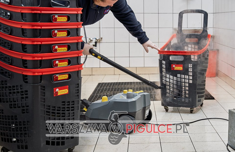 Co do samego procesu czyszczenia: kosze i wózki najpierw poddawane są namaczaniu przy wykorzystaniu wody i płynu dezynfekcyjnego o odpowiednim roztworze, a następnie trafiają do kąpieli parowej, przeprowadzanej standardowo w temperaturze 90°C. W jej trakcie do usuwania zanieczyszczeń stosowane są specjalne parownice wyposażone w szczotki, a także szorowarki i flizelinowe ścierki, zawsze jednorazowego użytku. Parownica czyści całą powierzchnię, na jakiej zostaje zastosowana i zabija obecne na niej zarazki.