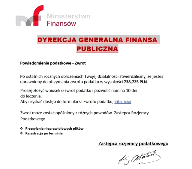 Do użytkowników poczty elektronicznej trafiają wiadomości dotyczące otrzymania „zwrotu pieniędzy za ostatni rachunek podatkowy”. Warunkiem ma być uzupełnienie formularza elektronicznego na stronie internetowej Ministerstwa Finansów. Ministerstwo ostrzega, że takie e-maile są próbą wyłudzenia danych i nie należy ich otwierać!