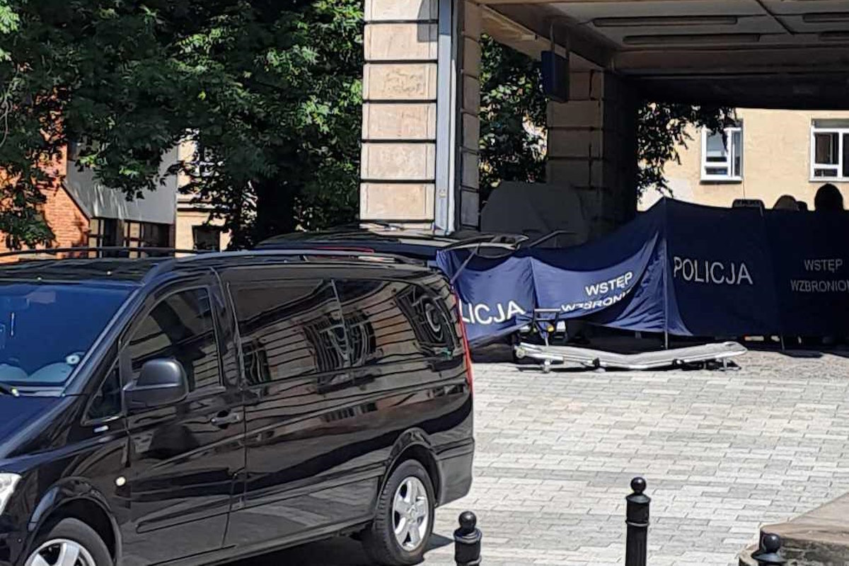 Doszło do zgonu. Parawan, policja i czarny samochód przy szpitalu na Lindleya