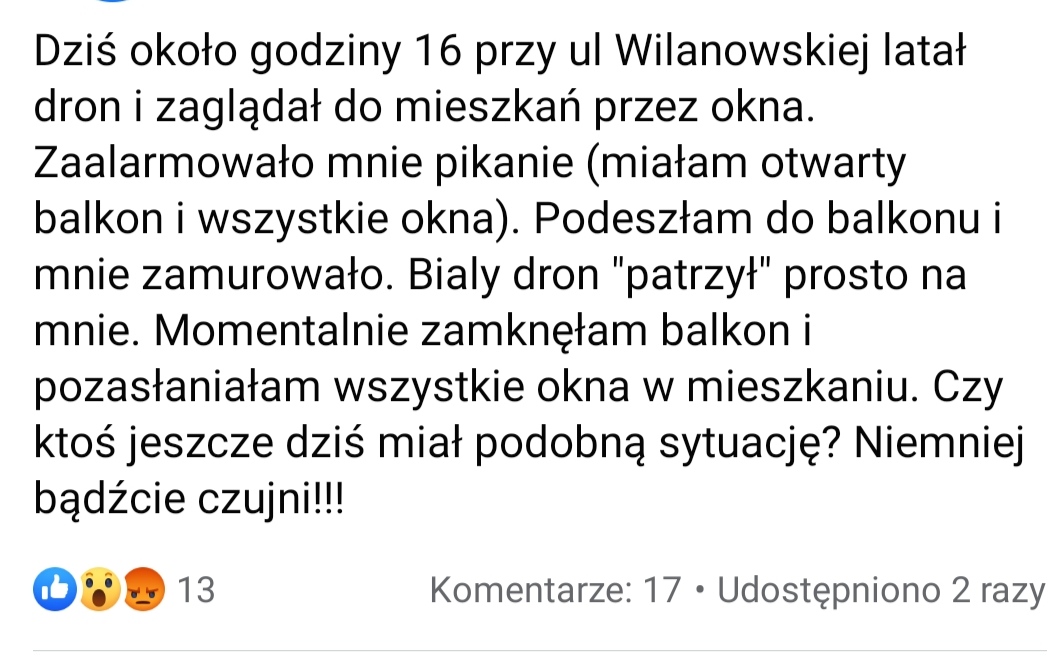 „Dziś około godziny 16 przy ul Wilanowskiej latał dron i zaglądał do mieszkań przez okna. Zaalarmowało mnie pikanie (miałam otwarty balkon i wszystkie okna). Podeszłam do balkonu i mnie zamurowało.