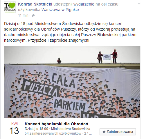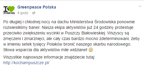 Wczoraj aktywiści z Greenpeace Polska wywiesili na budynku Ministerstwa Środowiska baner. Domagają się ochrony dla Puszczy Białowieskiej. Dziś protest trwa nadal, a zapał ekologów nie gaśnie, a już o 18:00 pod Ministerstwem Środowiska odbędzie się koncert solidarnościowy dla obrońców puszczy.