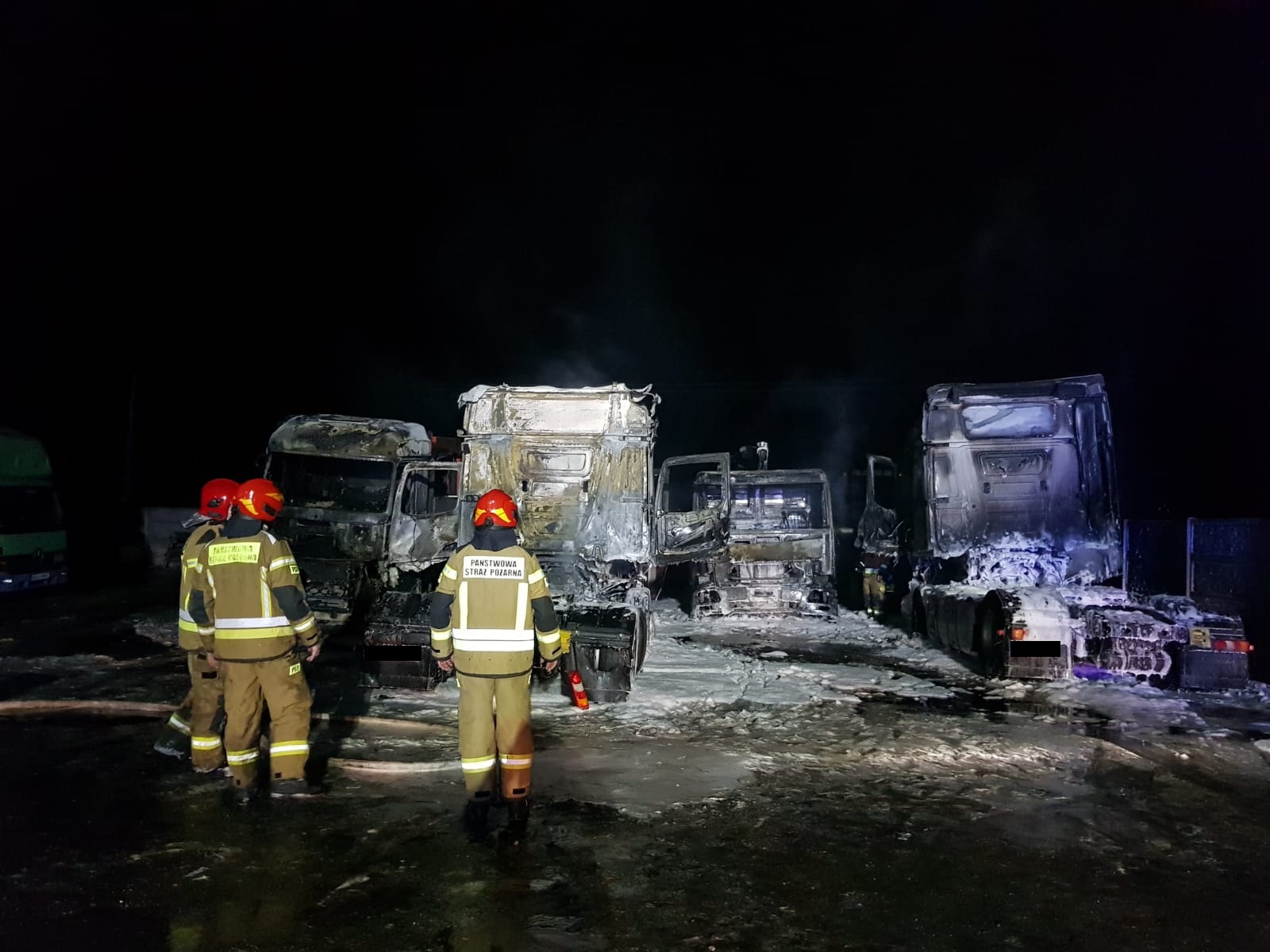 Na miejscu zastaliśmy pracujące już zastępy z OSP, ostatecznie zniszczeniu uległo sześć samochodów ciężarowych, niestety kilka z nich spłonęło doszczętnie.