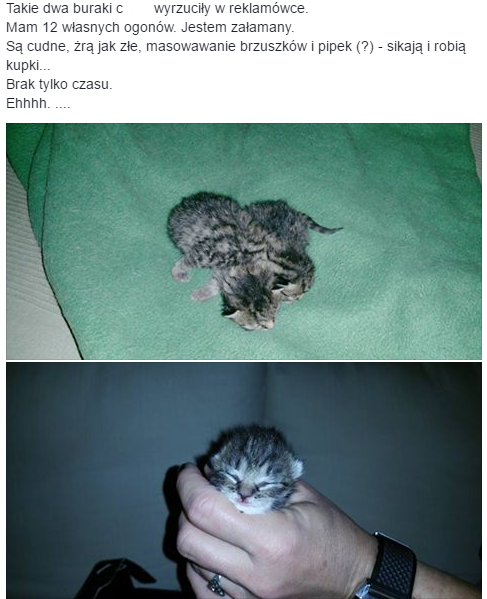 „Takie dwa buraki wyrzuciły w reklamówce. Mam 12 własnych ogonów. Jestem załamany.” – napisał Pan Rafał, który uratował kotki i wziął je do siebie do domu. Ma jednak już 12 swoich kotów i fizycznie nie da rady się nimi zajmować. Pomożecie?