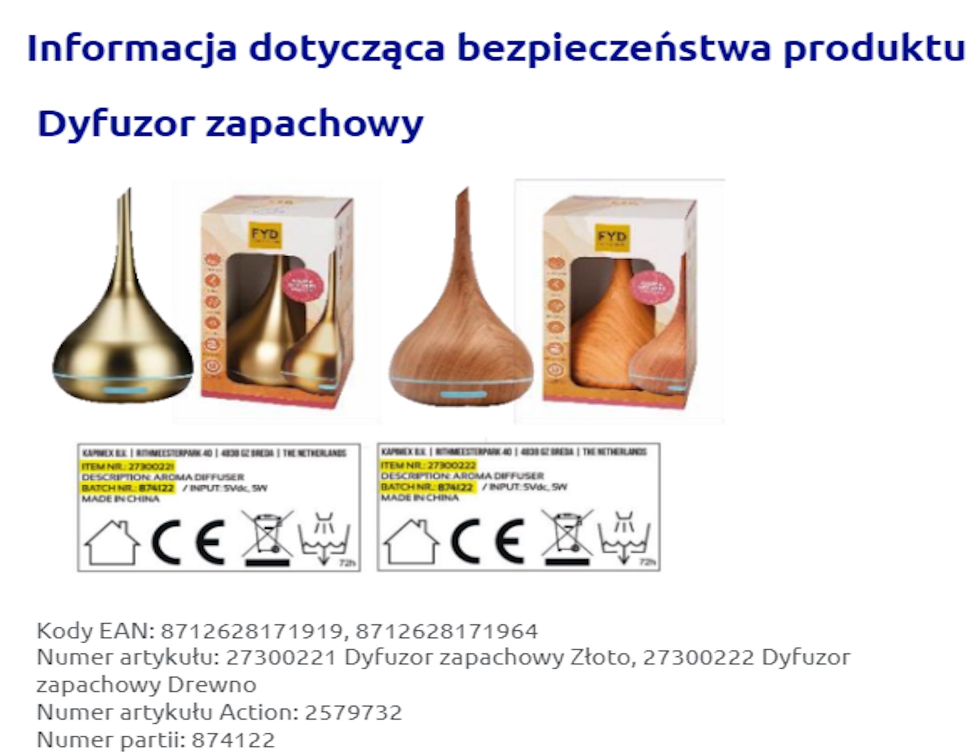 Dotyczy to produktów z kodami EAN 8712628171919 i 8712628171964, konkretnie numerów artykułu 27300221 (Dyfuzor zapachowy Złoto) i 27300222 (Dyfuzor zapachowy Drewno), które były dostępne w sklepach Action. Problem został wykryty w partii o numerze 874122.