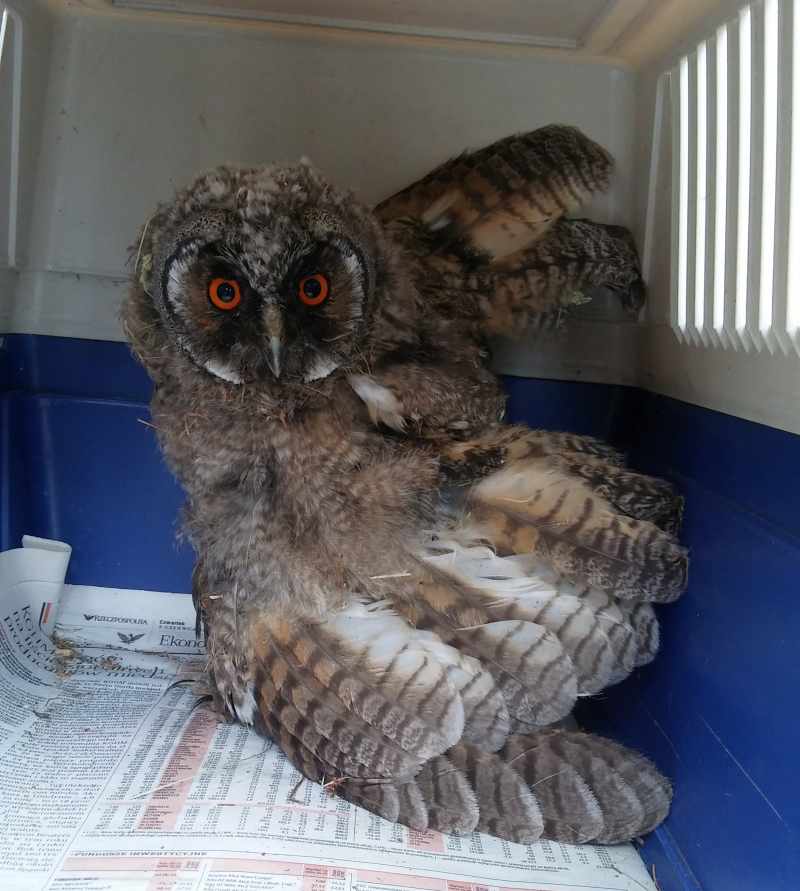 „Bawiące się na placu dzieci poinformowały nas, że ptak bez ruchu siedzi już od dłuższego czasu i nie reaguje na obecność ludzi. Młoda uszatka najprawdopodobniej wypadła z gniazda podczas nauki latania i uszkodziła sobie skrzydło. Była wychudzona i wyraźnie osłabiona, pozostawiona w tym miejscu bez pomocy człowieka nie miałaby szans na przeżycie – zainteresowałyby się nią inne drapieżniki” – relacjonuje podejmująca interwencję funkcjonariuszka Kinga Nowakowska z Ekopatrolu Straży Miejskiej m. st. Warszawy. Strażniczka podkreśla również godną pochwały reakcję bawiących się na placu dzieci, które do przyjazdu patrolu czuwały przy rannym ptaku aby nie zagroziły mu inne drapieżniki. Poinformowały również funkcjonariuszy, że sprawdziły pobliski teren, czy w pobliżu nie przebywa matka malucha.