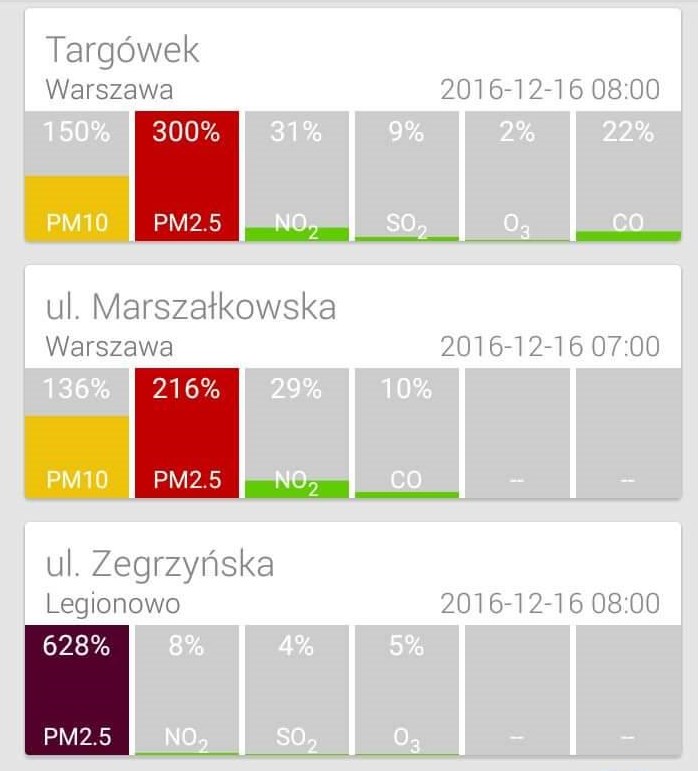 Wczorajsze prognozy WIOŚ na szczęście się nie sprawdziły. Wartości nie przekroczyły normy, a nawet podczas godzin szczytu były tylko nieznacznie większe. Dzisiaj, zapewne ze względu na mróz i ciągły opał wartości są dużo większe. W Warszawie mamy przekroczenie o 200-300 proc. W Legionowie już o ponad 600. Zalecane jest ograniczenie spacerów.
