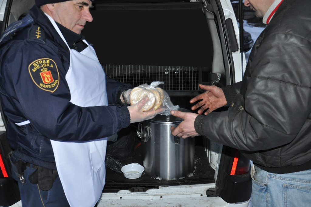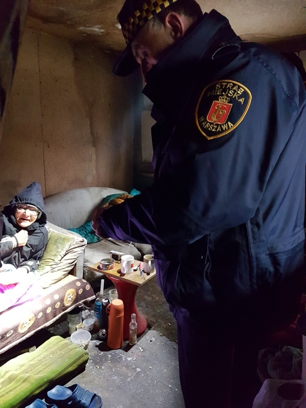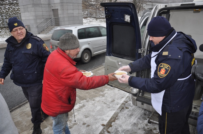Strażnicy wraz z ratownikami medycznymi regularnie odwiedzają blisko 150 miejsc w Warszawie, gdzie bezdomni znajdują schronienie. W razie potrzeby udzielają pomocy bądź przewożą w miejsca, gdzie ludzie pozbawieni dachu nad głową mogą ją znaleźć. Każdego dnia przeprowadzanych jest blisko ćwierć tysiąca interwencji związanych z osobami bezdomnymi.
