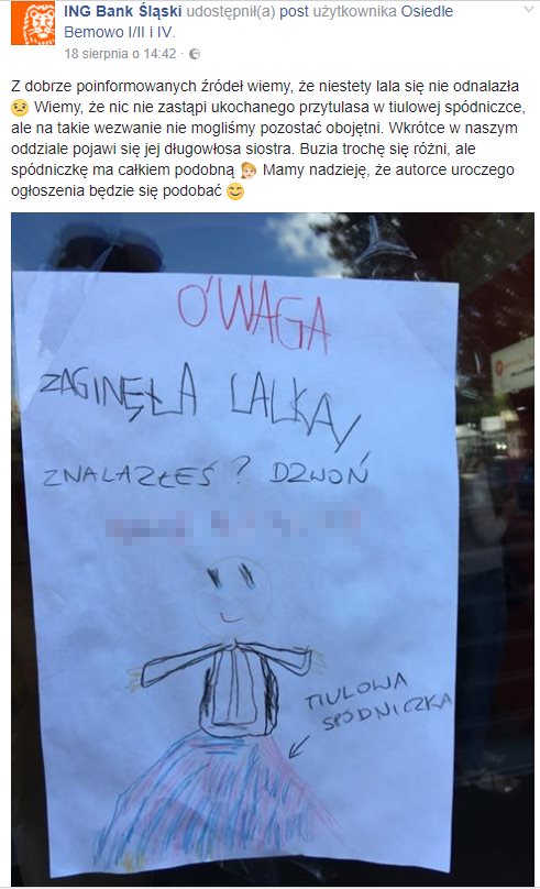 Na witrynie bemowskiego oddziału ING Banku Śląskiego zawisło ogłoszenie napisane przez małą Helenkę, która zgubiła swoją ulubioną lalkę. Zguba się nie odnalazła, jednak jest to historia z happy endem.