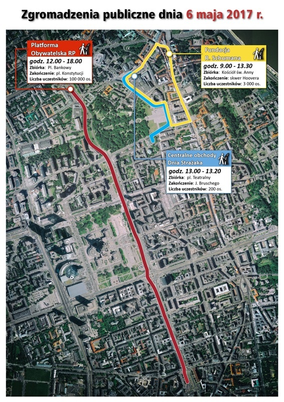 • godz. 13.00 planowane jest zgromadzenie publiczne na pl. Bankowym, a następnie od ok. godz. 13.15-13.30 przemarsz na trasie: pl. Bankowy – Marszałkowska – pl. Konstytucji, gdzie ok. godz. 18.00 planowane jest zakończenie zgromadzenia.