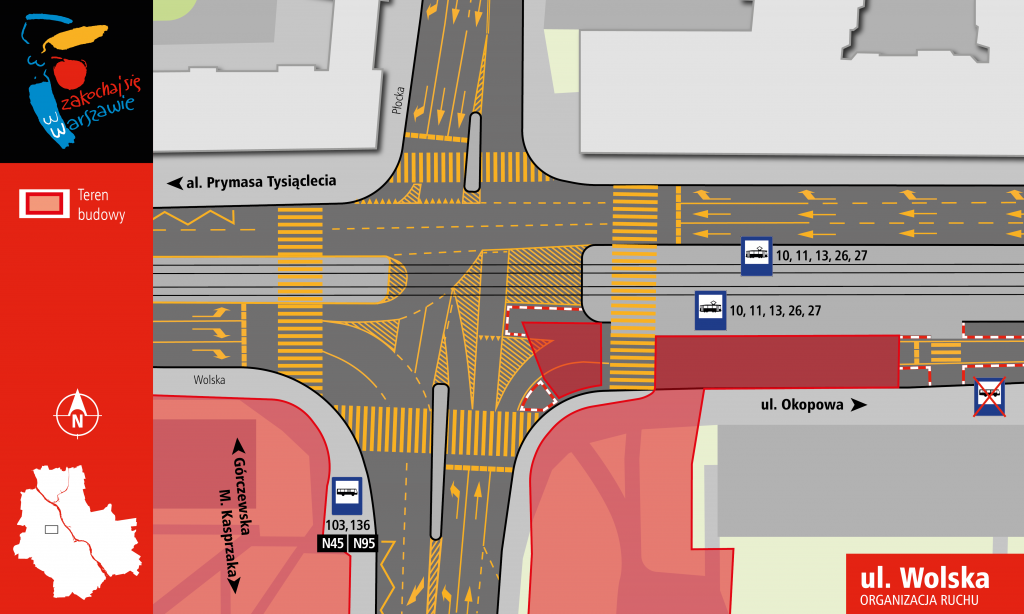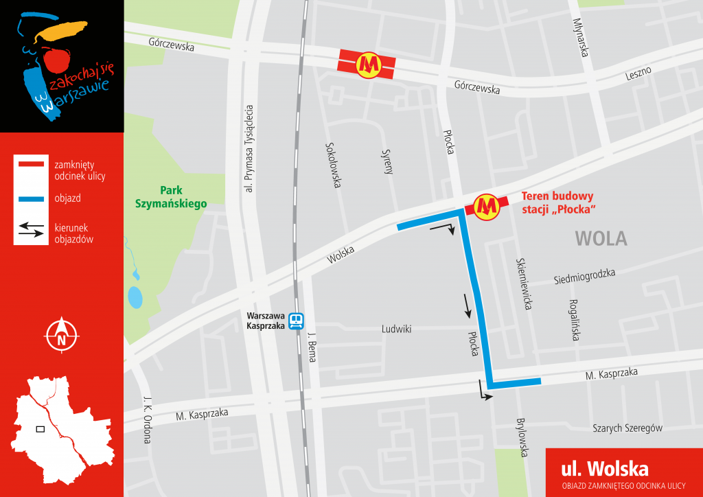 Zamknięta dla ruchu zostanie jezdnia prowadząca do centrum na odcinku od ul. Płockiej do ul. Skierniewickiej. Objazd prowadzi ulicami Płocką i M. Kasprzaka. Na skrzyżowaniu ul. Wolskiej z ul. Płocką zostaną wprowadzone zmiany w organizacji ruchu. Jadący od strony Bemowa będą musieli się rozjechać w prawo lub lewo w ul. Płocką (do skrętu w prawo będą dwa pasy ruchu). Natomiast dla jadących od strony centrum będą dwa pasy ruchu do jazdy na wprost i jeden wyłącznie do skrętu w prawo w ul. Płocką. Nie będzie możliwości skrętu w lewo, ale za skrzyżowaniem z ul. Płocką a przed placem budowy zostanie wytyczona zawrotka, którą kierowcy będą mogli przejechać na drugą jezdnię, żeby następnie skręcić w ul. Skierniewicką.