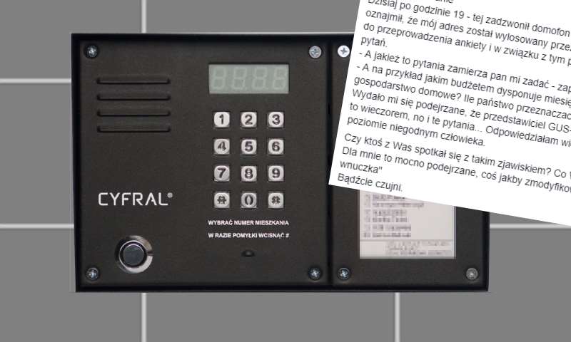 „Dzisiaj po godzinie 19 – tej zadzwonił domofon i pan bardzo miłym głosem oznajmił, że mój adres został wylosowany przez Główny Urząd Statystyczny do przeprowadzenia ankiety i w związku z tym pan chciałby mi zadać kilka pytań” – pisze internautka.