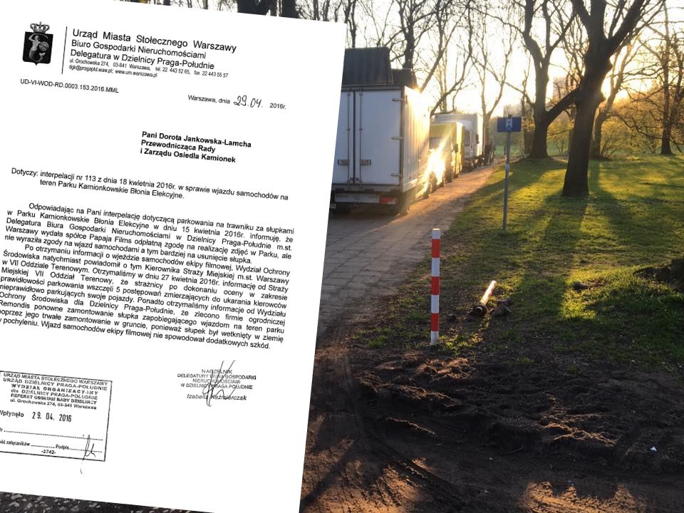 W odpowiedzi na interpelacje możemy przeczytać, że Dzielnica „wydała spółce Papaja Films odpłatną zgodę na realizację zdjęć w Parku, ale nie wyraziła zgody na wjazd samochodami, a tym bardziej na usunięcie słupka”