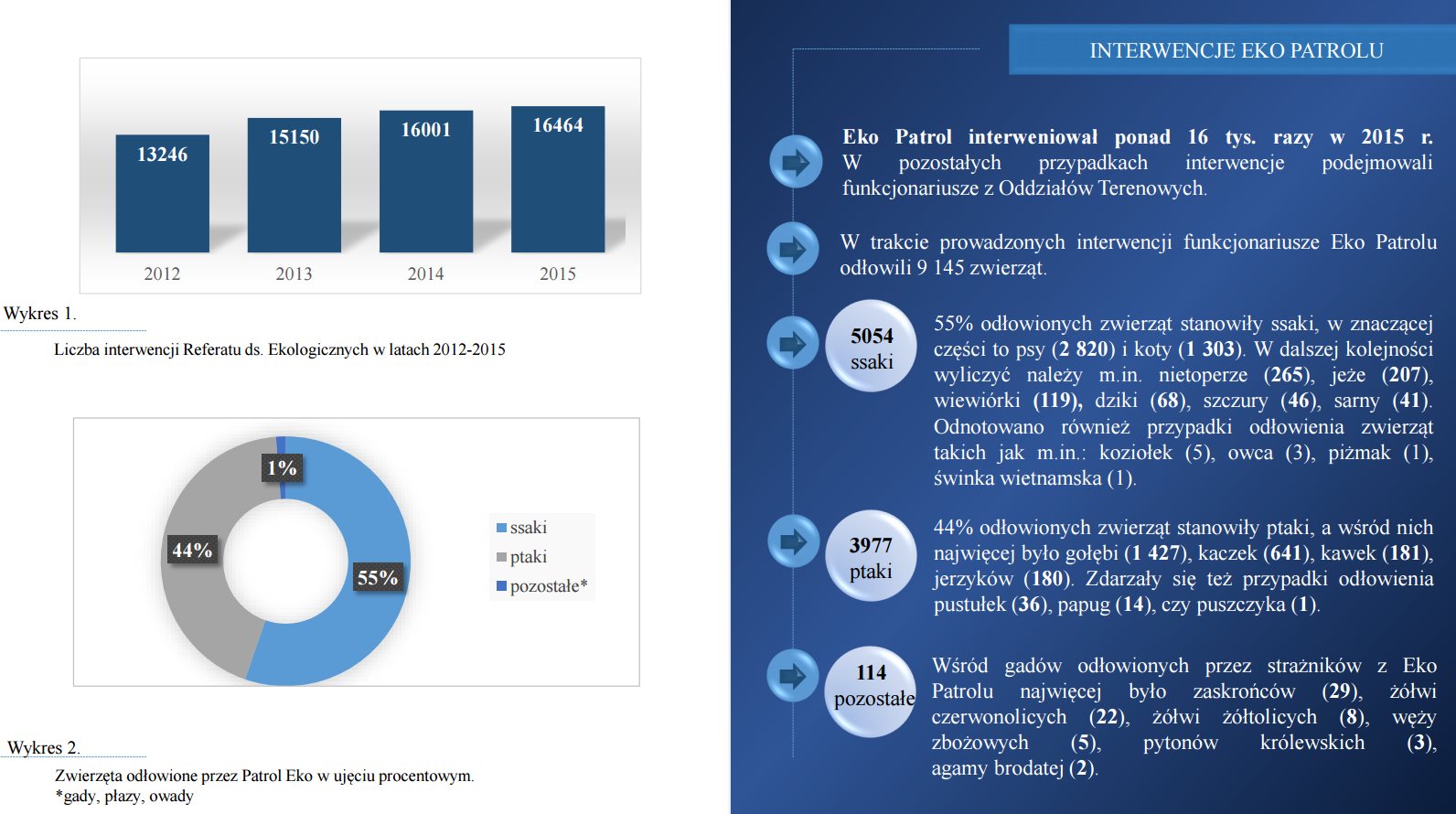 43 funkcjonariuszy pracujących w Eko Patrolu, a więc Referatu ds. Ekologicznych Straży Miejskiej ocenia rok 2015 jako rekordowy pod względem interwencji. W 2015 r. straż miejska przyjęła 34 026 zgłoszeń dotyczących zwierząt. Był to kolejny rok, w którym odnotowano wzrost zainteresowania losem zwierząt. W porównaniu do 2014 r. liczba zgłoszeń wzrosła o 4%.