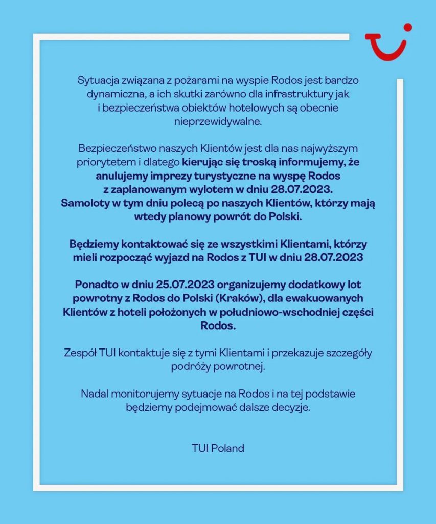 Jak tłumaczył biuro komunikacie zamieszczonym na swoim fanpage’u sytuacja związana z pożarami jest bardzo dynamiczna i chodzi o bezpieczeństwo wczasowiczów.