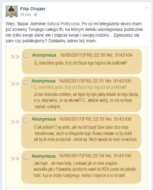 Filip Chajzer opublikował prośbę o podanie danych twórcy, który stworzył obrzydliwy „mem” o śmierci jego dziecka oraz danych fanpage’a, który to rozpowszechnił. Minęły trzy godziny i dziennikarz wszedł w posiadanie tych informacji. Fanpage przeprasza, a admin… (przynajmniej tez wskazany przez Filipa Chajzera) „ma bekę”.