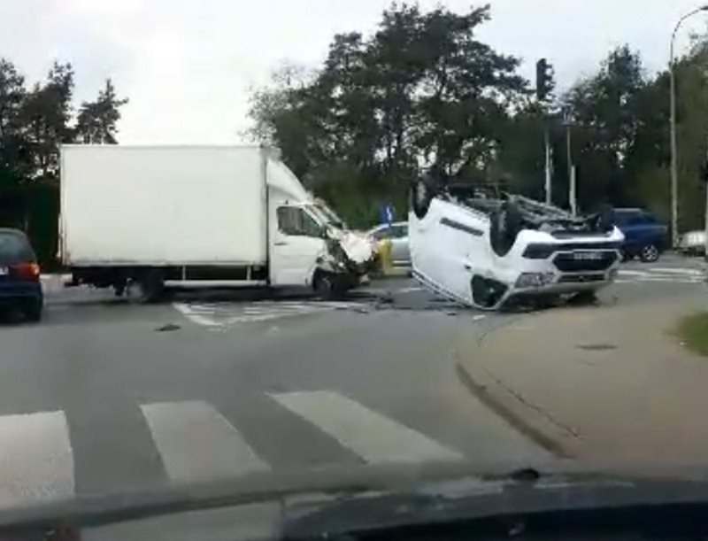 Ford na dachu, ciężarówka uszkodzona. Wypadek na Płochocińskiej