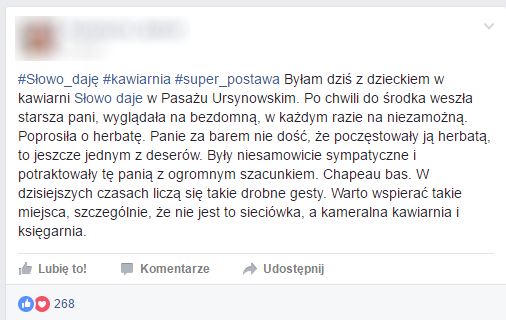 „Byłam dziś z dzieckiem w kawiarni Słowo daje w Pasażu Ursynowskim. Po chwili do środka weszła starsza pani, wyglądała na bezdomną, w każdym razie na niezamożną. Poprosiła o herbatę. Panie za barem nie dość, że poczęstowały ją herbatą, to jeszcze jednym z deserów. Były niesamowicie sympatyczne i potraktowały tę panią z ogromnym szacunkiem. Chapeau bas. W dzisiejszych czasach liczą się takie drobne gesty. Warto wspierać takie miejsca, szczególnie, że nie jest to sieciówka, a kameralna kawiarnia i księgarnia.”