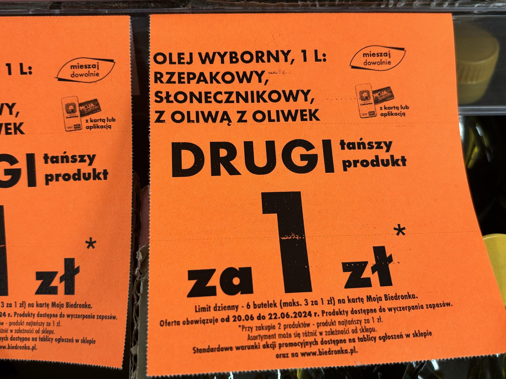 Promocja obowiązuje od 20 do 22 czerwca 2024 roku w sklepach Biedronka na terenie całej Polski. Warunkiem skorzystania z oferty jest posiadanie karty lojalnościowej „Moja Biedronka” lub aplikacji. Każdy klient może zakupić maksymalnie 6 butelek oleju dziennie, z czego trzy mogą być nabyte w ramach promocji po 1 zł.