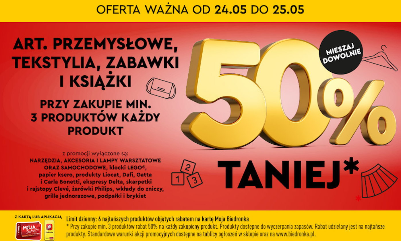 Od 24 do 25 maja Biedronka oferuje wyjątkową okazję na zakupy z ogromnymi zniżkami. W tych dniach klienci mogą skorzystać z niesamowitej promocji, która obniża ceny wybranych produktów aż o 50%! To świetna okazja, by zaopatrzyć się w artykuły przemysłowe, tekstylia, zabawki i książki po niesamowicie niskich cenach.