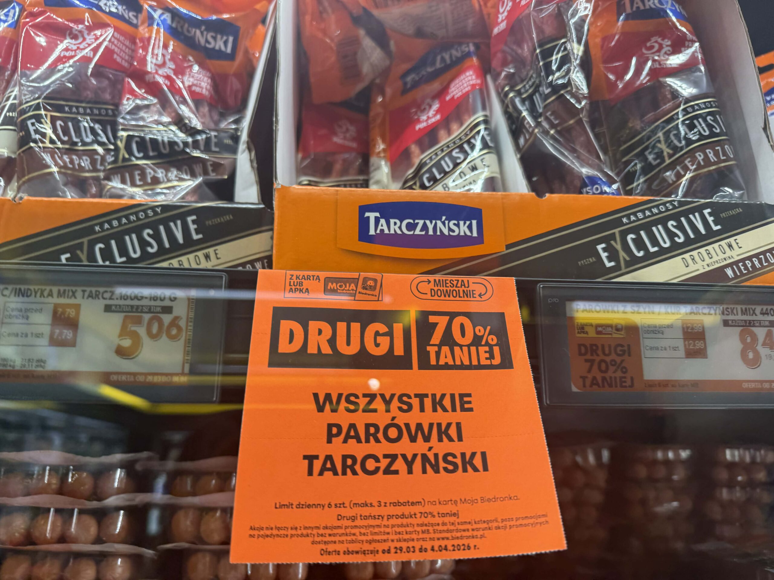 - mocne obniżki na artykuły spożywcze, w tym makarony czy parówki nawet „drugi produkt 70% taniej”