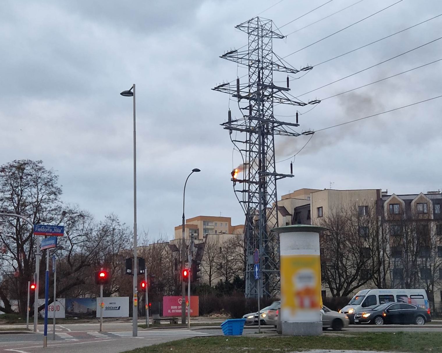 Przy ul. Mikołajczyka 1 na Gocławiu słychać było głośny huk i widać błysk oraz iskry i smugę dymu. Jak się okazało doszło do wybuchu na maszcie wysokiego napięcia.