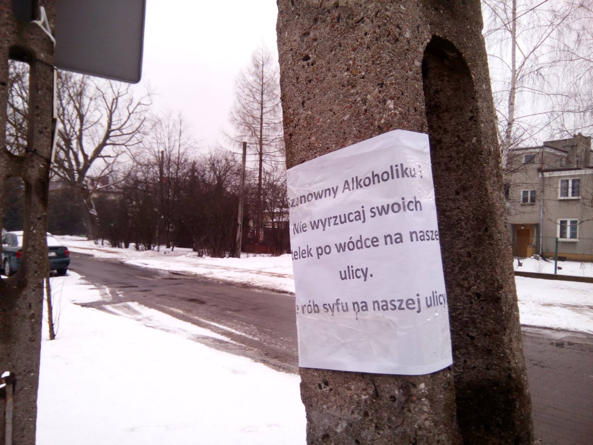 Gocławek – uprzejma prośba sąsiadów: ,,Szanowny Alkoholiku, Nie wyrzucaj swoich butelek po wódce na naszej ulicy. Nie rób syfu na naszej ulicy.” – napisał autor kartki umieszczonej na słupie na rogu ulic Sztabowej i Koprzywiańskiej.