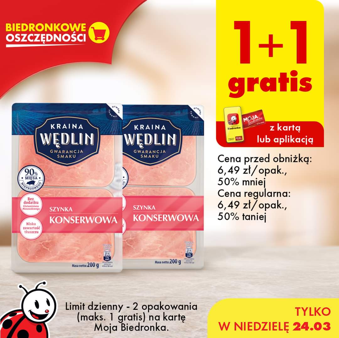 W ramach promocji, przy zakupie jednego opakowania szynki konserwowej z linii „Kraina Wędlin”, drugie opakowanie odbierzesz całkowicie za darmo.