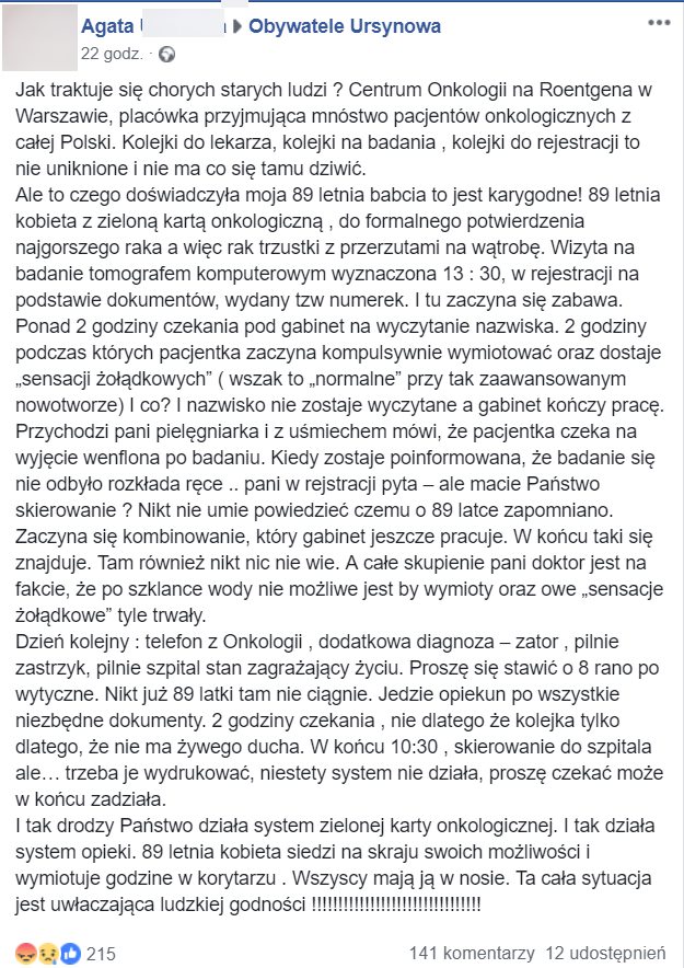 I tak drodzy Państwo działa system zielonej karty onkologicznej. I tak działa system opieki. 89 letnia kobieta siedzi na skraju swoich możliwości i wymiotuje godzine w korytarzu . Wszyscy mają ją w nosie. Ta cała sytuacja jest uwłaczająca ludzkiej godności !!!!!!!!!!!!!!!!!!!!!!!!!!!!!!!!” – pisze Pani Agata.