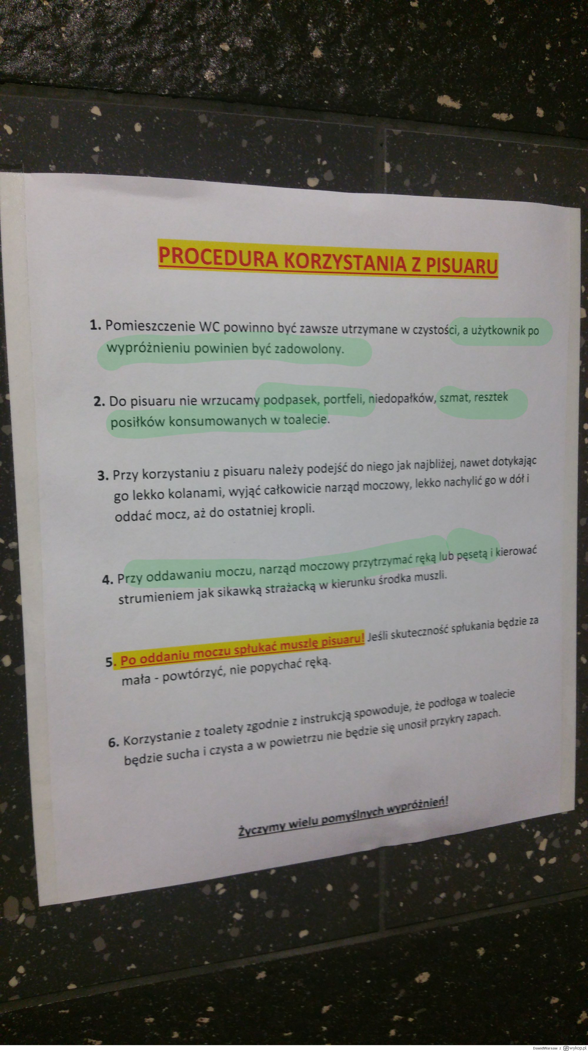 Jeden z Mirków z Wykopu podzielił się instrukcją na jaką natrafił w biurowcu na ul. Brzeskiej 2 w Warszawie. Jak na prawdziwą korpo-toaletę przystało instrukcja jest utrzymana w stylu humorystycznym. Bije jednak na głowę wszystkie pozostałe.