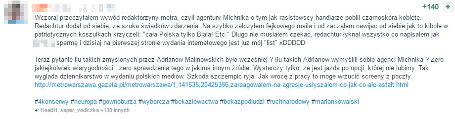 Niedawno warszawskie Metro opublikowało sprawę pobicia czarnoskórej kobiety przez sprzedawców. Do dziś nie wiadomo, jak wyglądało zdarzenie, bo redakcja czeka nadal na opis z policji. Metro opublikowało też list, jaki dostała redakcja. „Świadek” opisuje temat swoimi słowami. Nie byłoby w tym nic dziwnego, gdyby nie to, że cały opis jest zmyślony, a internauta pochwalił się swoim „wyczynem” na portalu wykop.pl.