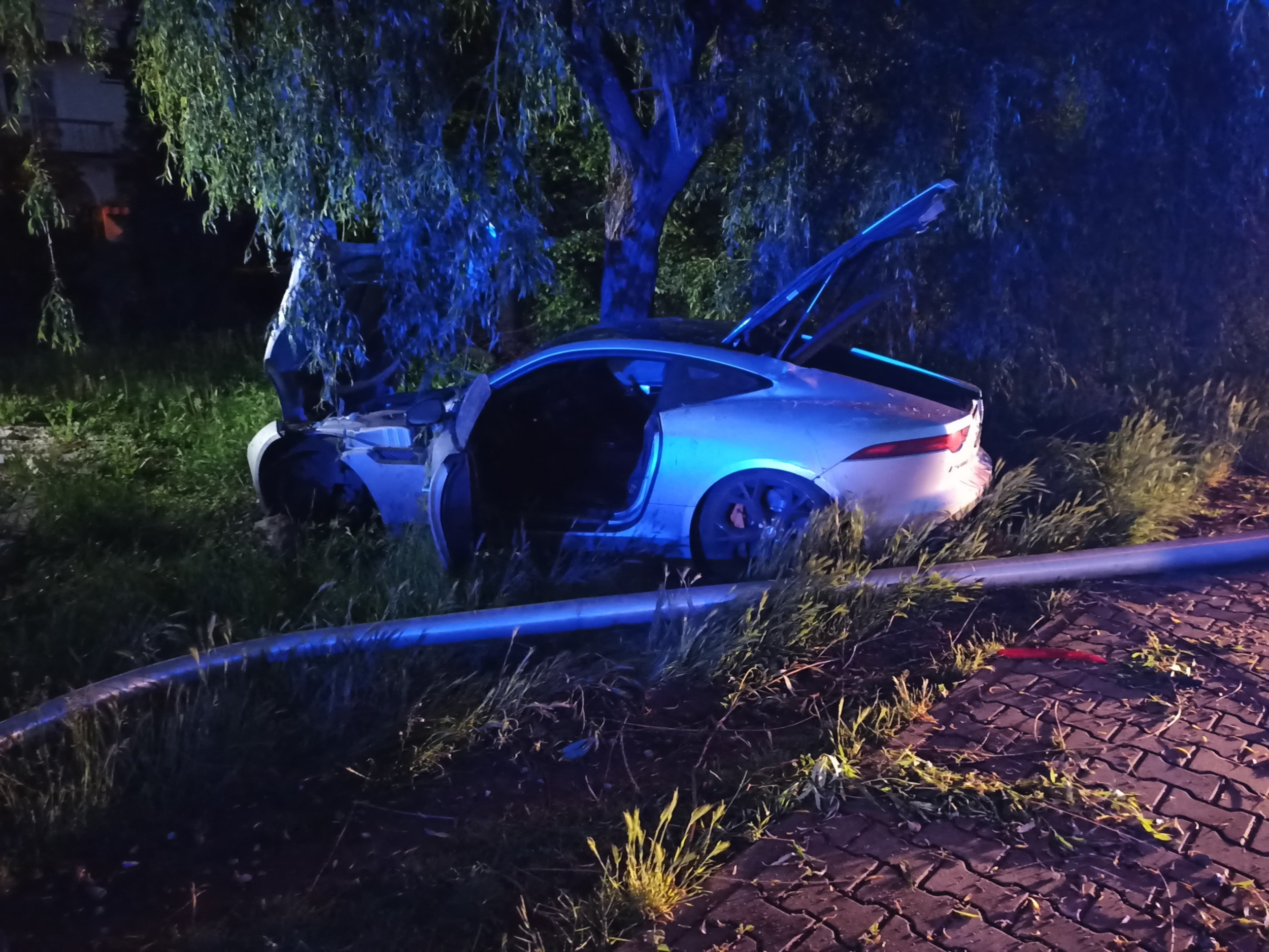 Jaguar uderzył w latarnię i drzewo! Na miejscu policja i dwa zastępy straży pożarnej