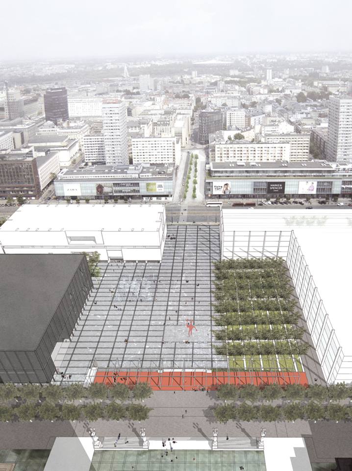 Zalecenia: Należy rozważyć pozostawienie oryginalnego tarasu PKiN oraz przemyśleć zachowanie trybuny w obrębie placu. Sąd konkursowy zwraca uwagę na konieczność skoordynowania poziomu głównego placu z rzędnymi planowanych budynków oraz zaleca analizę zastosowania zagłębienia kosztem górnego poziomu parkingu. Należy też rozważyć rozluźnienie układu drzew w bezpośrednim sąsiedztwie instytucji kultury w celu ułatwienia ich funkcjonowania.
