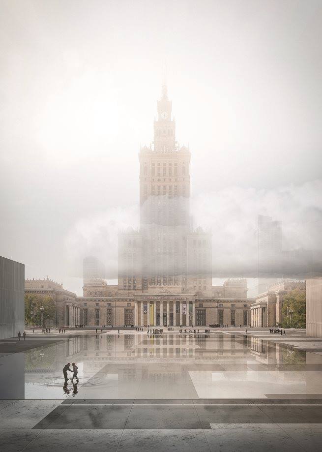 Uzasadnienie wyboru pracy: Nagrodę przyznano za propozycję wydzielenia dwóch poziomów placu, reinterpretację roli Pałacu Kultury i Nauki w przestrzeni placu oraz dyskretne nawiązanie do przeszłości.