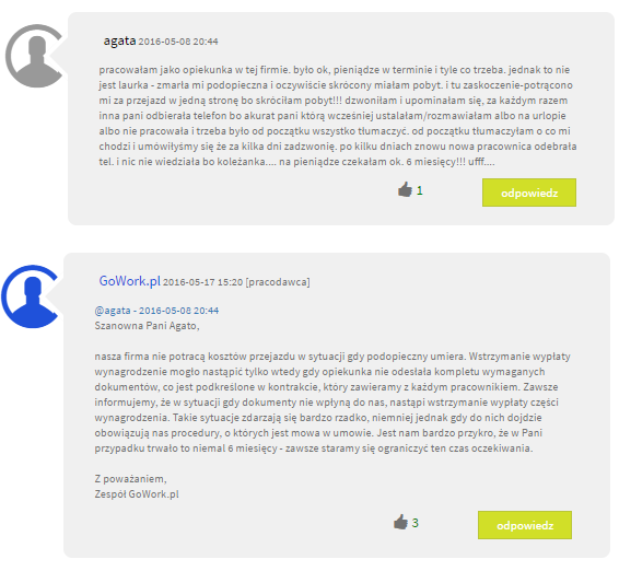 Takie działania pokazują, że przedsiębiorstwo dba o swoich pracowników. Połączenie merytorycznych odpowiedzi z przedstawieniem firmowych eventów pozytywnie wpływa na wizerunek przedsiębiorstwa. Tym samym zwiększa się szansa, że w przypadku pojawienia się negatywnych opinii na temat pracy w firmie, bezstronny użytkownik zaufa pracodawcy, bo ten dał mu ku temu stosowne podstawy.