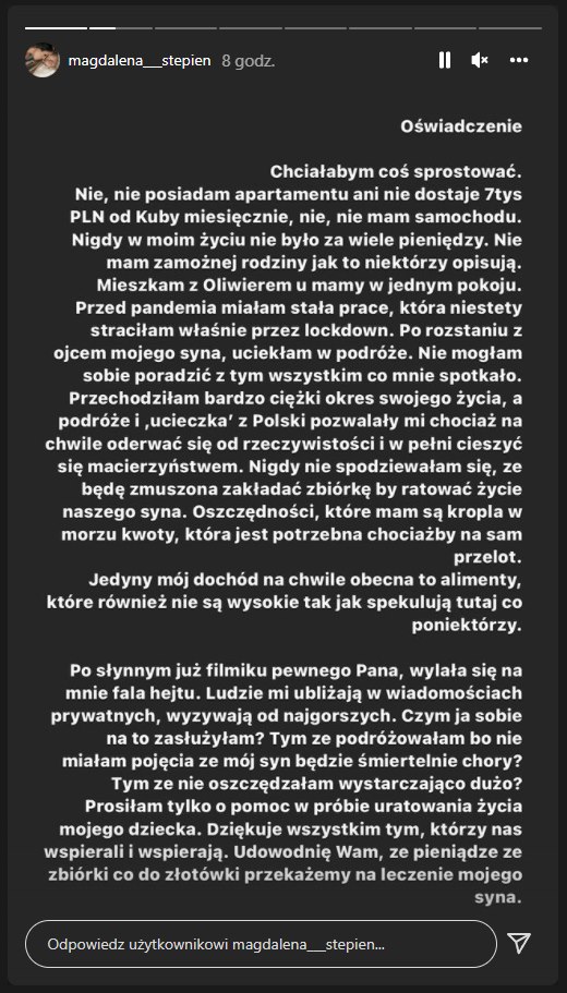 Jest oświadczenie Magdaleny Stępień po filmie Dzikiego Trenera. Tłumaczy w nim, że nie ma pieniędzy