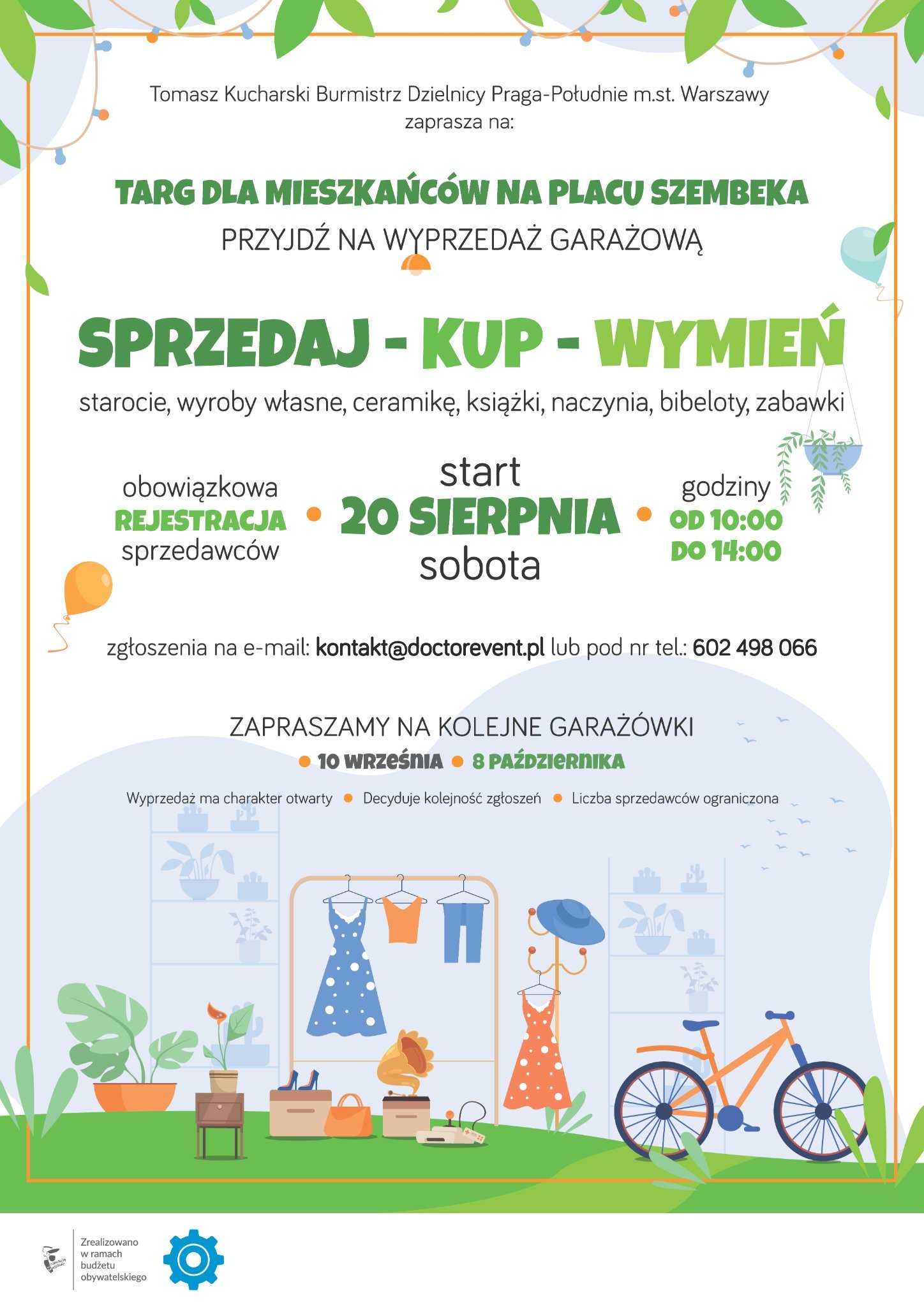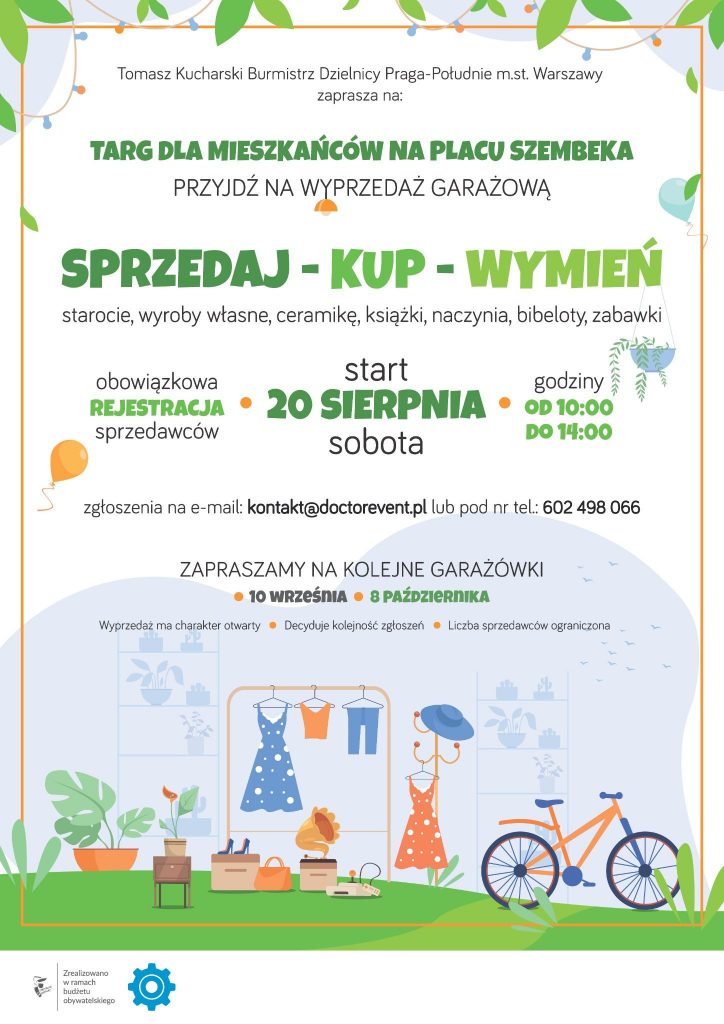 Serdecznie zapraszam na wyprzedaż garażową, która odbędzie się 20 sierpnia w godz. 10:00 -14:00 na placu Piotra Szembeka – pisze Tomasz Kucharski, burmistrz dzielnicy Praga-Południe.