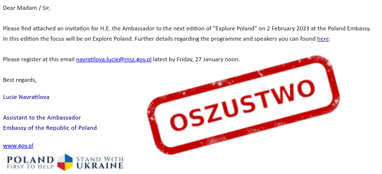 Rys. 1 Przykładowa wiadomość email podszywająca się pod polską ambasadę i nakłaniająca do kliknięcia w złośliwy link.