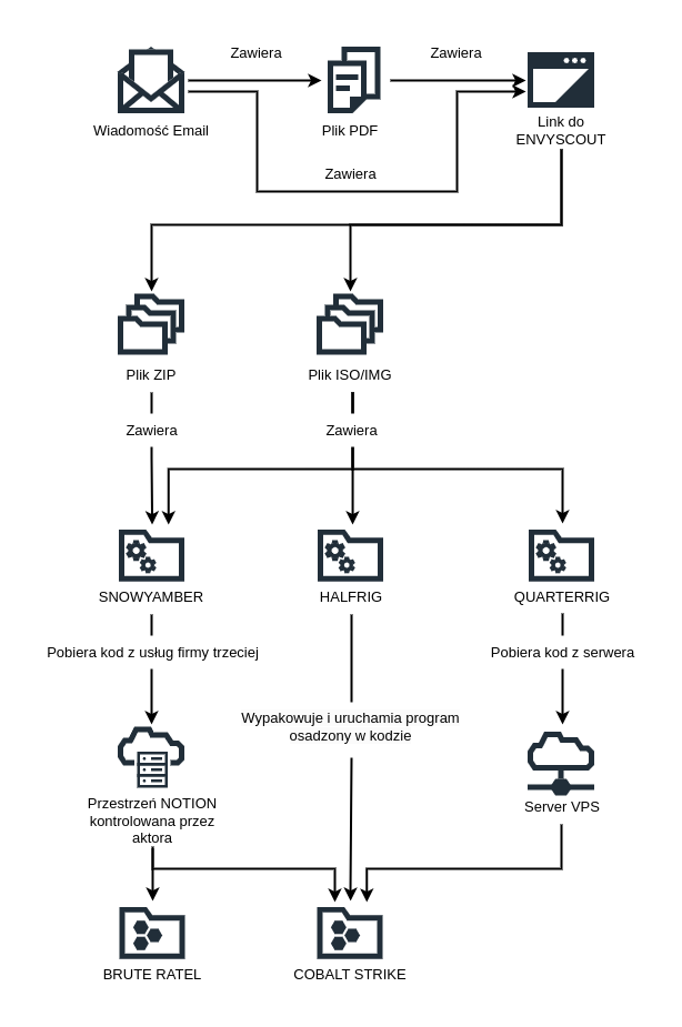 Narzędzia SNOWYAMBER oraz QUARTERRIG były używane jako tzw. downloader’y. Oba narzędzia przesyłały do aktora adres IP oraz nazwę komputera i użytkownika, które służyły do oceny czy ofiara jest interesująca oraz prawdopodobnie, czy nie jest to środowisko do analizy złośliwego oprogramowania. Jeżeli zainfekowana stacja robocza przeszła pomyślnie ręczną weryfikację, wykorzystywano wspomniane downloader’y celem dostarczenia i uruchomienia komercyjnych narzędzi COBALT STRIKE lub BRUTE RATEL. Z kolei HALFRIG działa na zasadzie tzw. loadera – zawiera w sobie i uruchamia automatycznie narzędzie COBALT STRIKE.