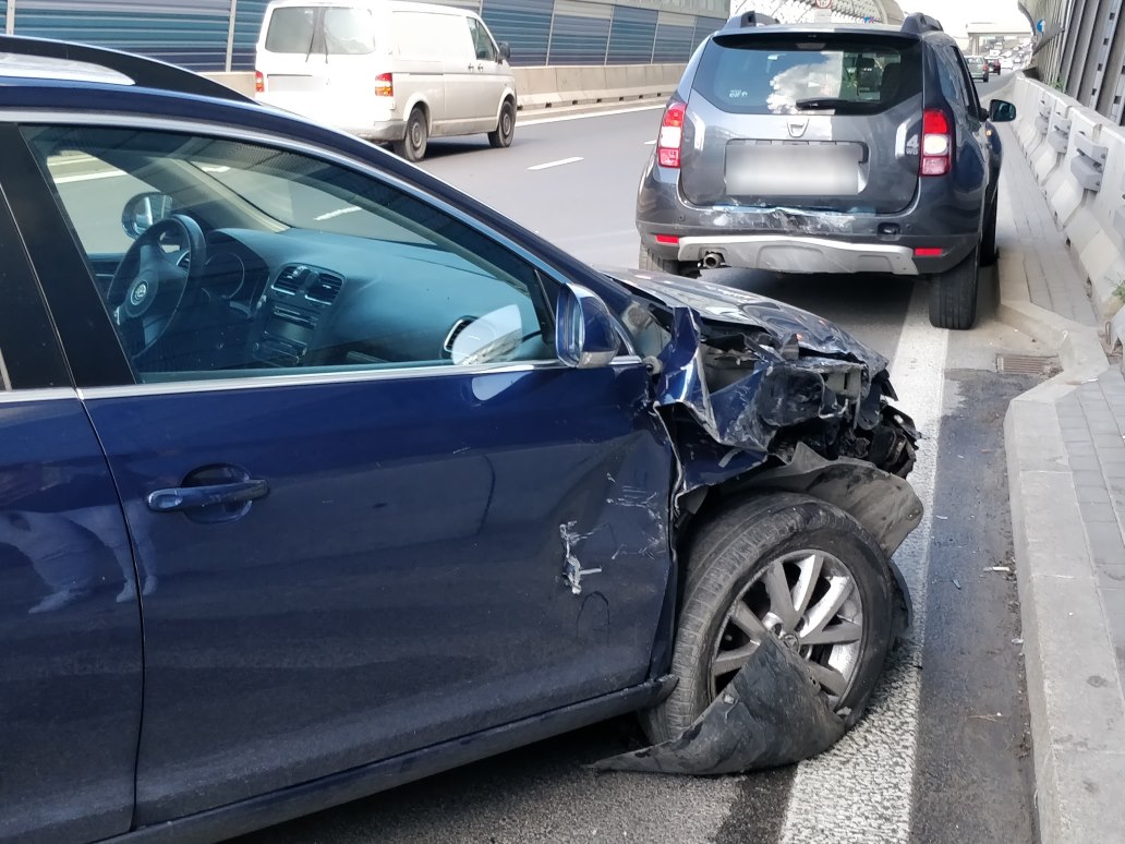 Pomiędzy ulicami Wysockiego i Rembielińską na pasach lokalnych w kierunku Marek doszło do zderzenia 5 pojazdów – 4 samochodów osobowych i motocykla.
