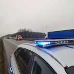 Na miejscu pracują policjanci, którzy wyjaśniają przebieg i okoliczności 3 zdarzeń drogowych z udziałem 8 pojazdów (2 pojazdy ciężarowe, bus i 5 samochodów osobowych).