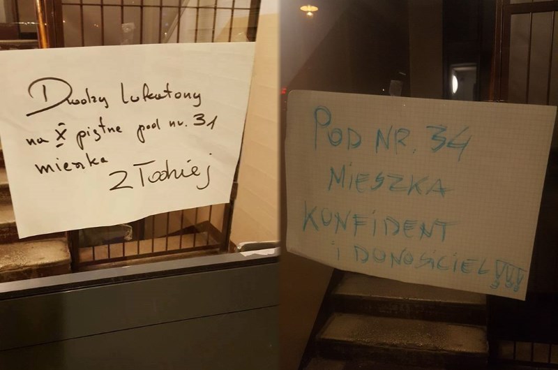Zabawne kartki rozwiesiło dwóch mieszkańców blogu przy ul. Magellana na warszawskim Ursynowie. Autor zdjęcia, za którego zgoda je publikujemy opisał Panów, jako „Kargula i Pawlaka XXI wieku”.