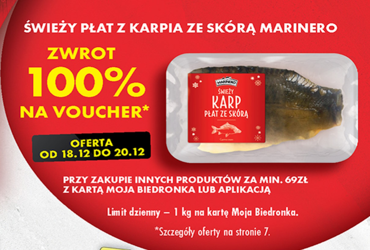 W tygodniu przedświątecznym, od 18 do 20 grudnia, Biedronka wychodzi z atrakcyjną ofertą dla swoich klientów. W ramach promocji, przy zakupach za minimum 69 zł, klienci będą mieli wyjątkową okazję zakupić świeży płat karpia ze skórą Marinero z 100% zwrotem na voucher.