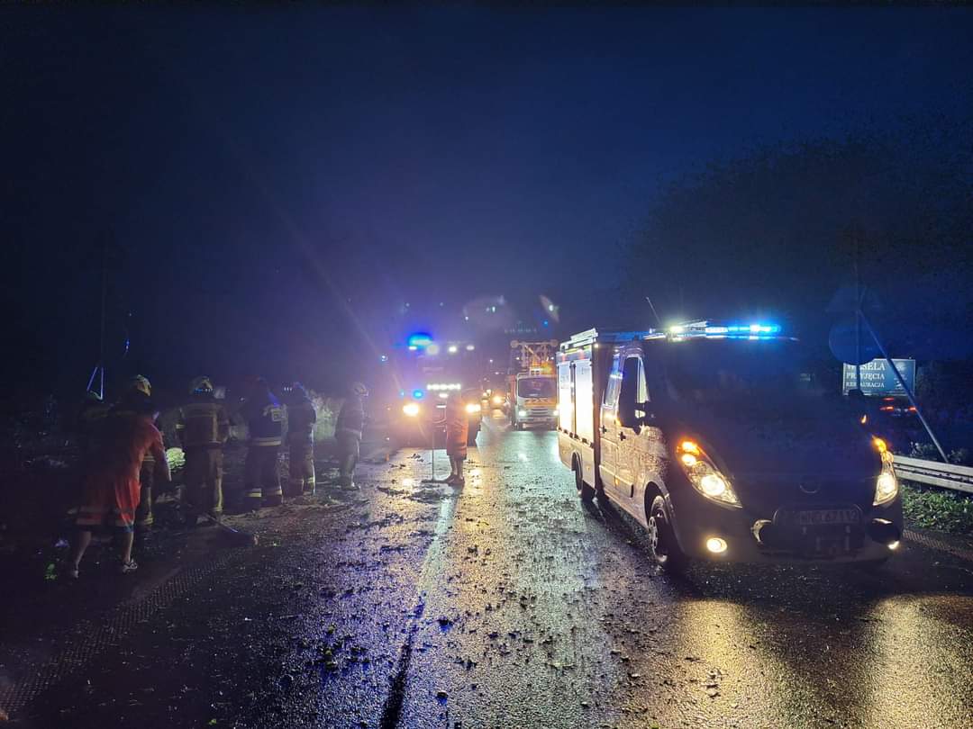 Strażacy z całego powiatu zostali natychmiastowo zadysponowani do usunięcia skutków nawałnicy. Powalone drzewa blokowały drogi, uszkadzały linie energetyczne i budynki, a intensywne opady deszczu doprowadziły do zalania piwnic i innych niskopołożonych pomieszczeń. Sytuacja była na tyle poważna, że wymagała zaangażowania wszystkich dostępnych Sił i Środków z terenu powiatu.