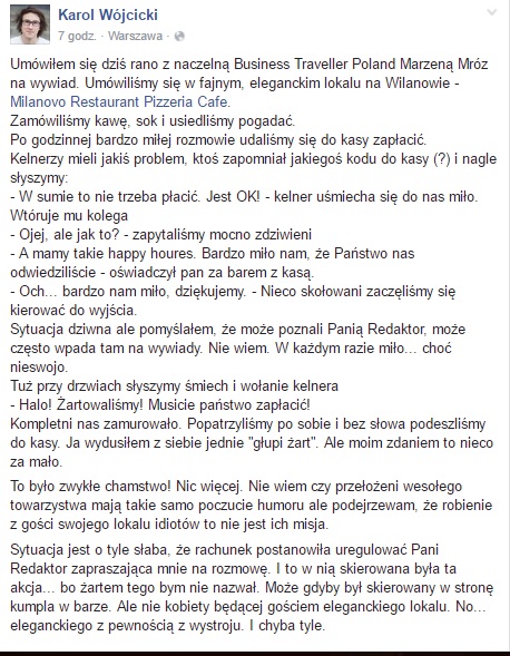 Sprawę opisał Karol Wójcicki. Znany jest jako popularyzator astronomii w Centrum Nauki Kopernik i jako postać medialna często udziela wywiadów. Nie inaczej było i tym razem. Przeczytacie jednak co się stało, kiedy wywiad się skończył i przyszło do płacenia rachunku.