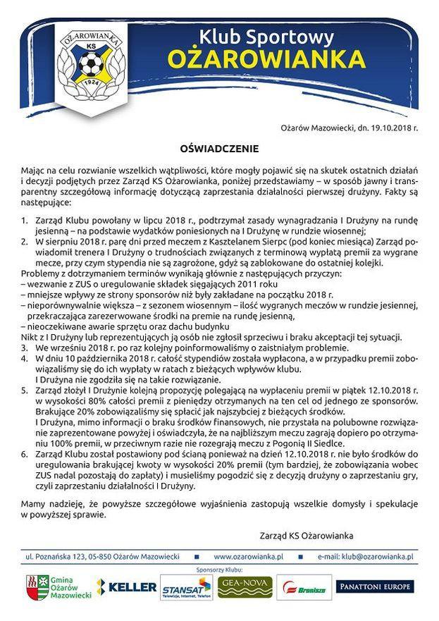 Klub Sportowy Ożarowianka, który znajdował się na drugim miejscu czwartej ligi mazowieckiej wycofał się z rozgrywek. Powodem było to, że… za często wygrywał.