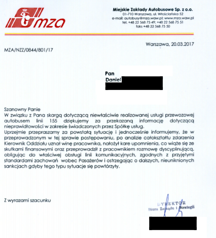 O sprawie informowaliśmy w połowie marca i obiecaliśmy do niej powrócić. Pan Daniel spytał kierowcę czemu zamknął mu drzwi przed nosem. W odpowiedzi usłyszał, że „jest debilem i ma wypier***ć”. Pasażer złożył skargę, a MZA przyznało mu rację i przesłało przeprosiny.