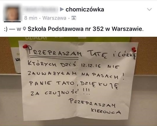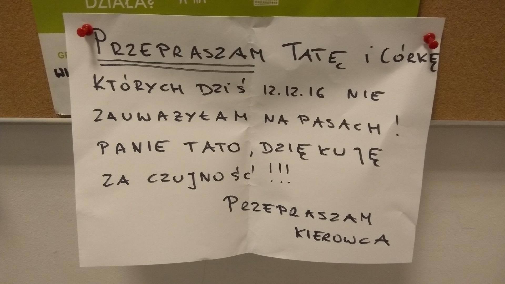 Dość nietypowy list (przeprosiny?) pojawił się dziś w Szkole Podstawowej nr 352 w Warszawie. Kierująca pojazdem nie zauważyła na przejściu dla pieszych taty i córki. Gdyby nie czujność ojca mogłoby skończyć się to bardzo źle. Kobieta w dość nietypowy sposób postanowiła podziękować tacie dziewczynki.