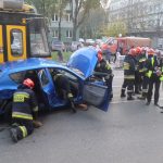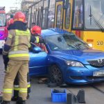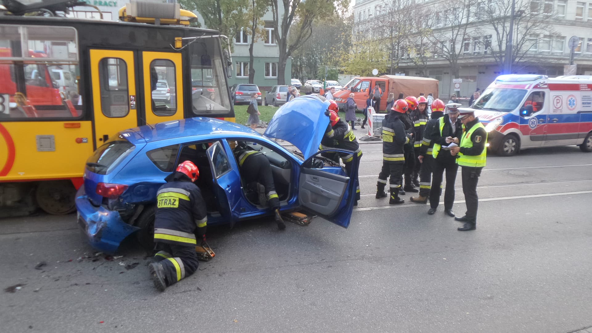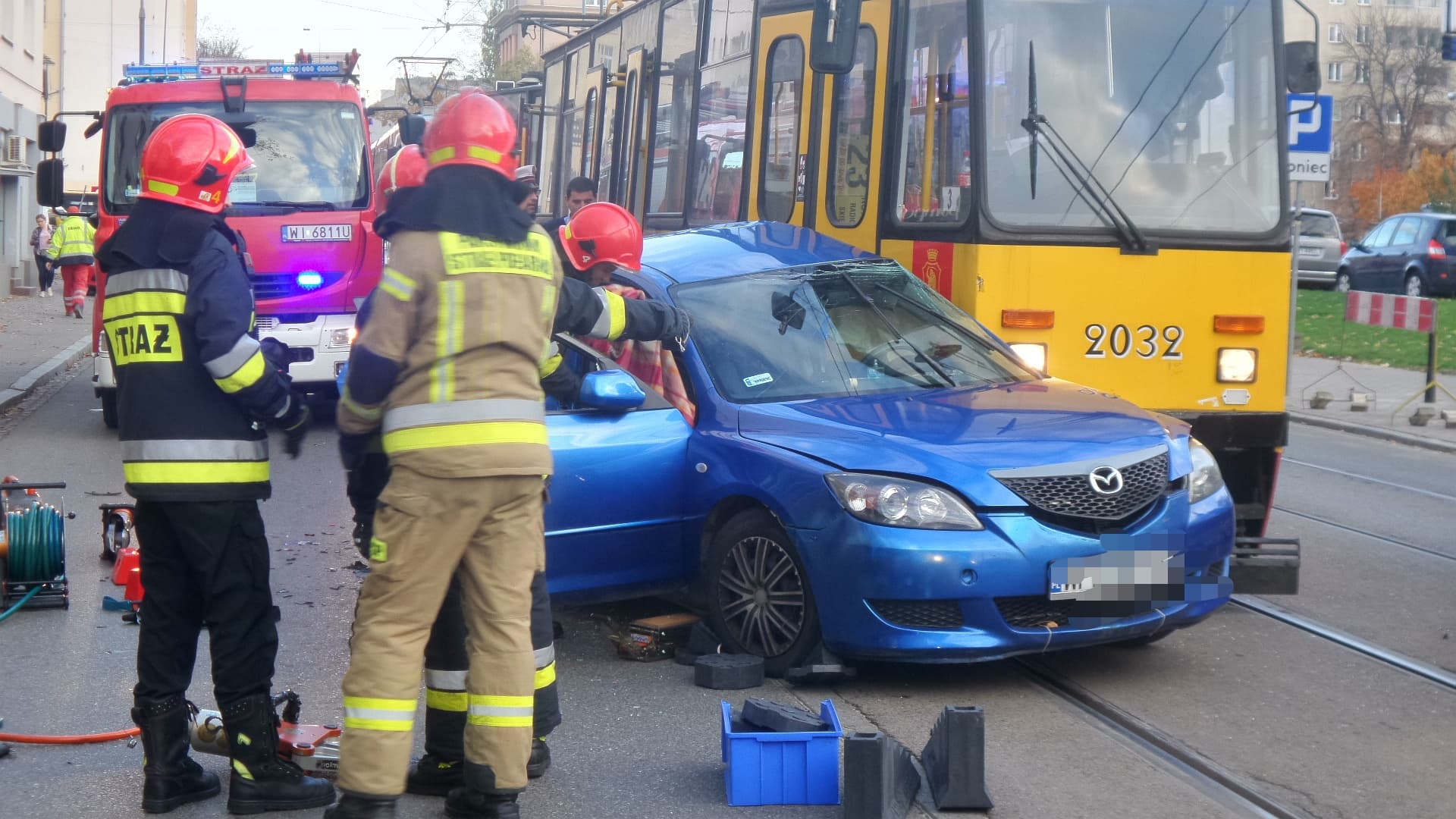 Kierujący osobówką wjechał pod tramwaj. Strażacy wycinali zakleszczoną osobę z samochodu