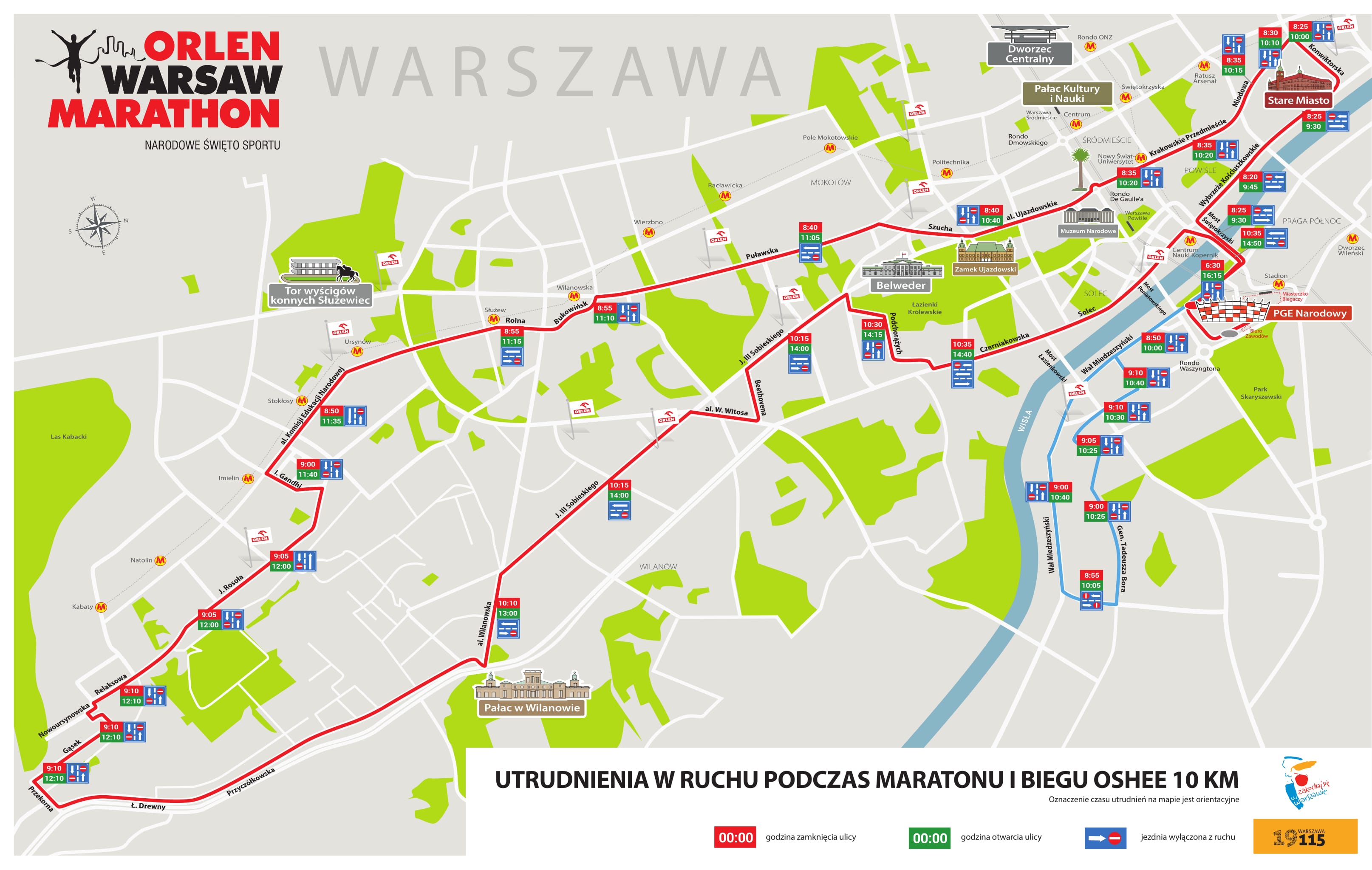 Start i meta biegu znajdą się na ul. Wybrzeże Szczecińskie przed Stadionem PGE Narodowym. Ze względu na montaż sceny odcinek od mostu Józefa Poniatowskiego do mostu Świętokrzyskiego będzie wyłączony z ruchu i parkowania od godz. 6.30 do godz. 16.15. Uczestnicy Orlen Warsaw Marathon wystartują w niedzielę o godz. 9.00 z ul. Wybrzeże Szczecińskie. Wraz z przemieszczaniem się biegaczy sukcesywnie będą wyłączane z ruchu kolejne ulice: