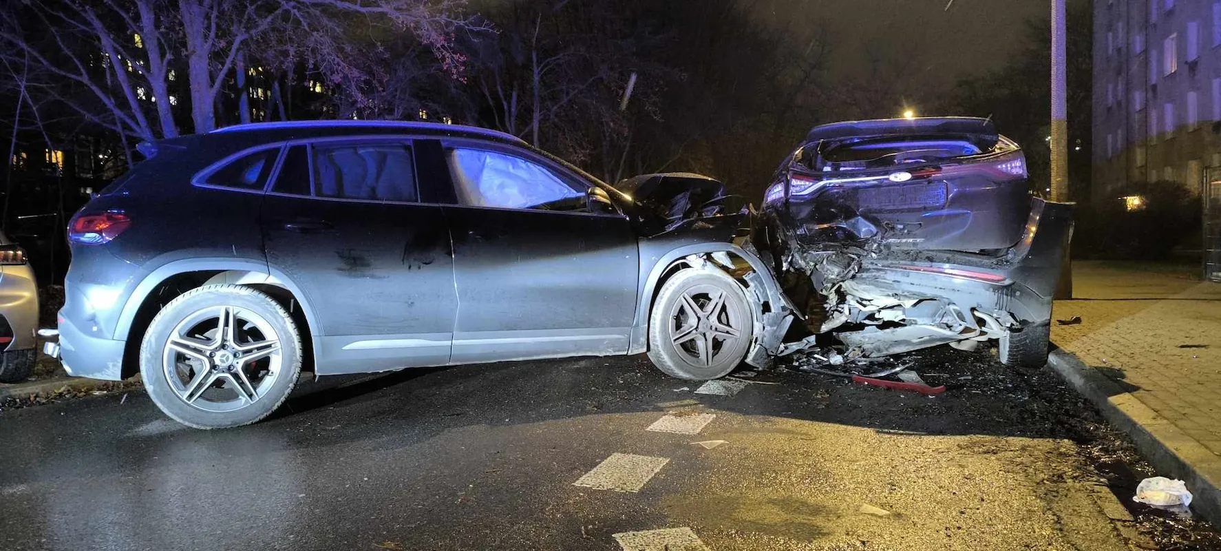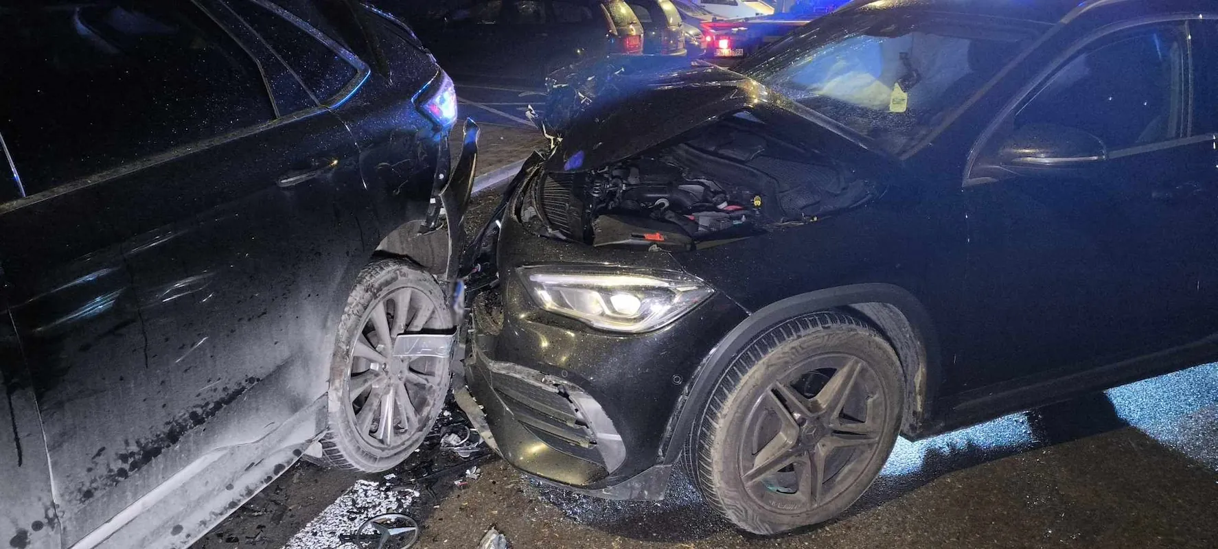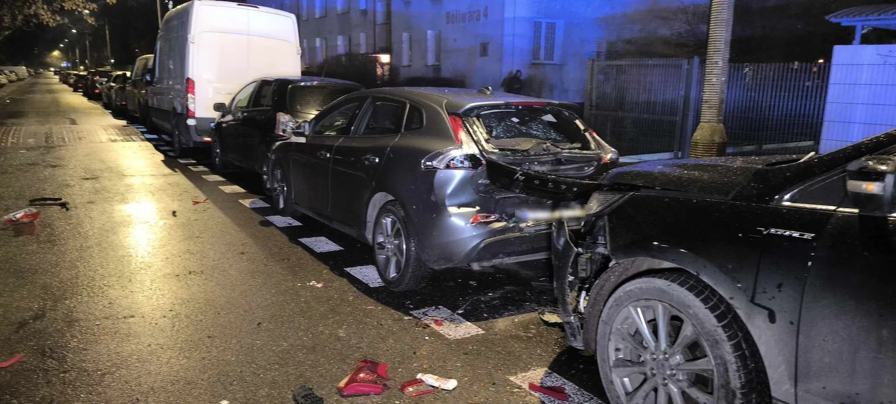 Na zdjęciach z miejsca zdarzenia widać znaczne uszkodzenia kilku pojazdów. Siła uderzenia była na tyle duża, że jeden z samochodów ma poważnie zniszczony tył. Na miejscu rozsypane są części karoserii i elementy plastikowe. Łącznie uszkodzonych zostało pięć aut, część najprawdopodobniej w wyniku efektu domina.